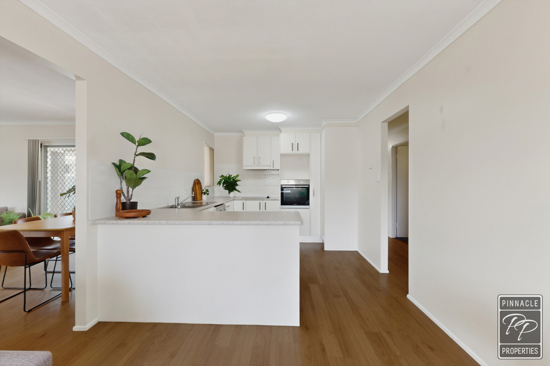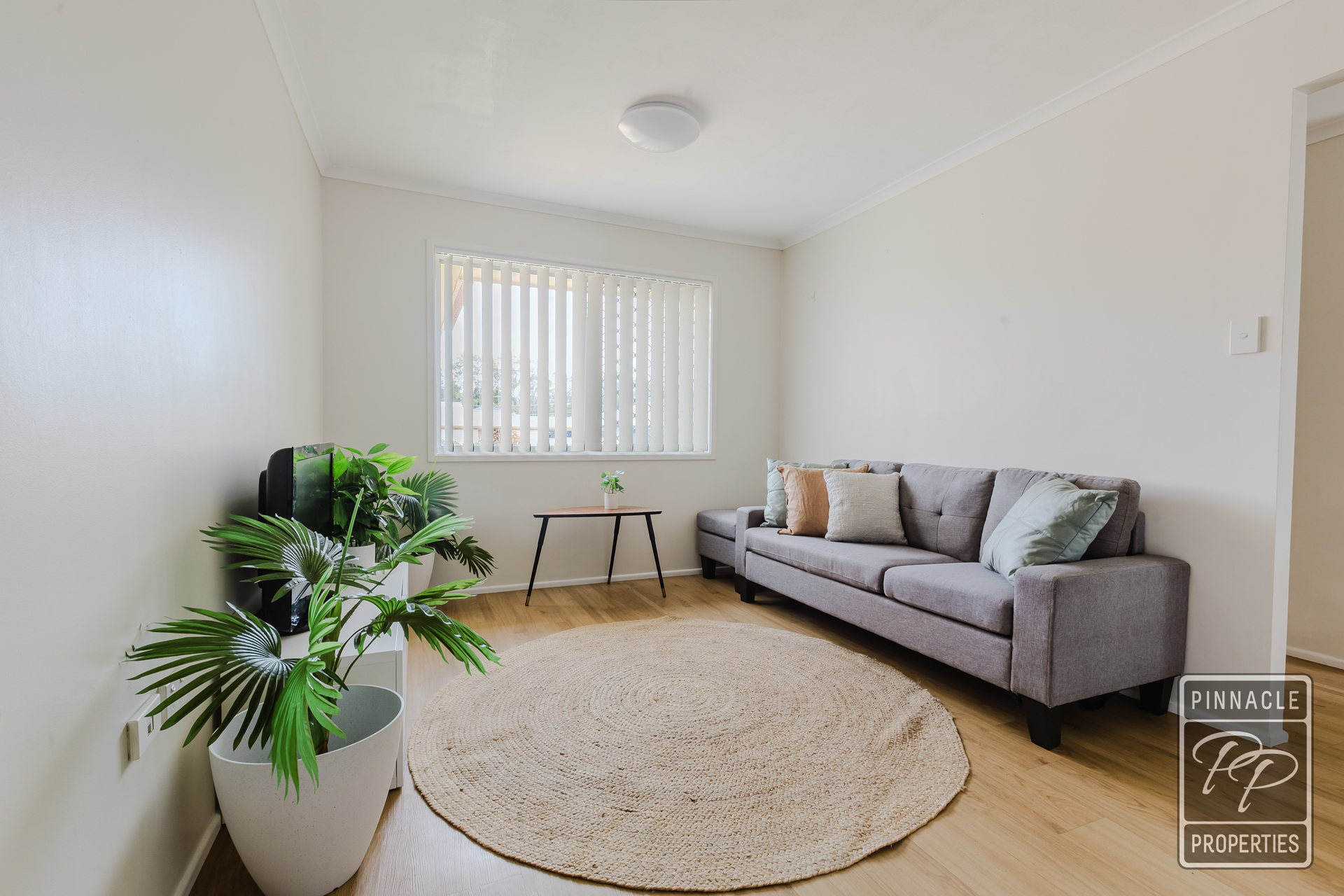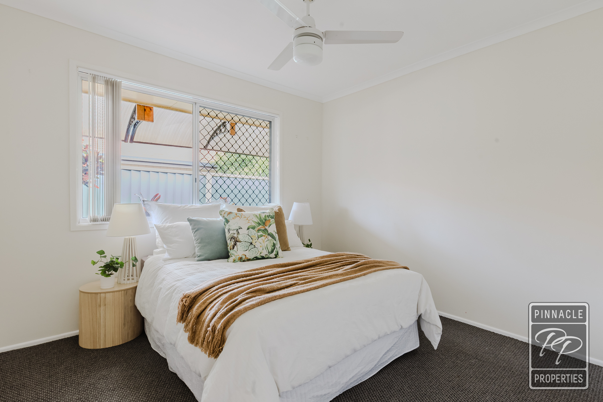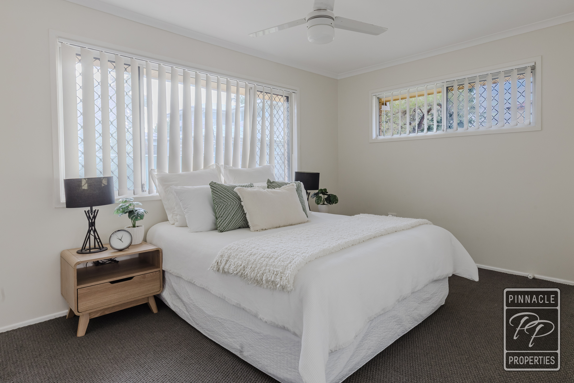 All three bedrooms are carpeted and fitted with ceiling fans. The spacious main bedroom includes built-in robes, while the remaining two bedrooms are also well sized, with one featuring built-in storage. The bedrooms are conveniently located near the family bathroom, which includes a separate toilet.