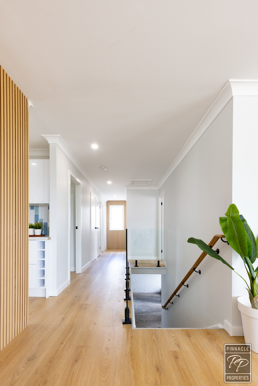 The open plan living dining room is flooded with natural light, with large sliding glass doors opening to the front patio, with stunning view to the mountains. The gorgeous timber feature wall draws you further into the home and is repeated at the end of the hallway.