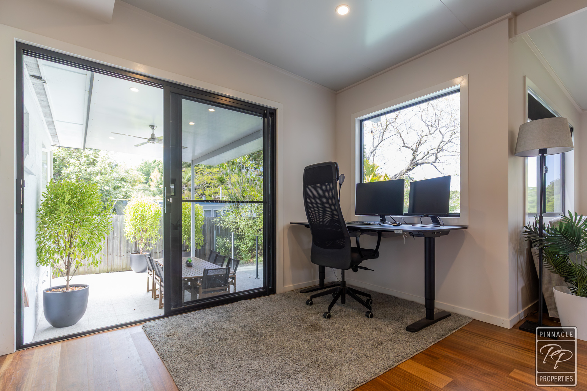 As you walk down the garden path to the front deck, you will feel welcomed. On entering the front door, you are greeted by a lovely open plan living room and kitchen. The living room opens to the front deck, through sliding glass doors, flooding the room with natural light and air flow. Air conditioned and ceiling fans ensure your year-round comfort, and with original timber hard wood floors, the living area is truly a comfortable place to unwind.