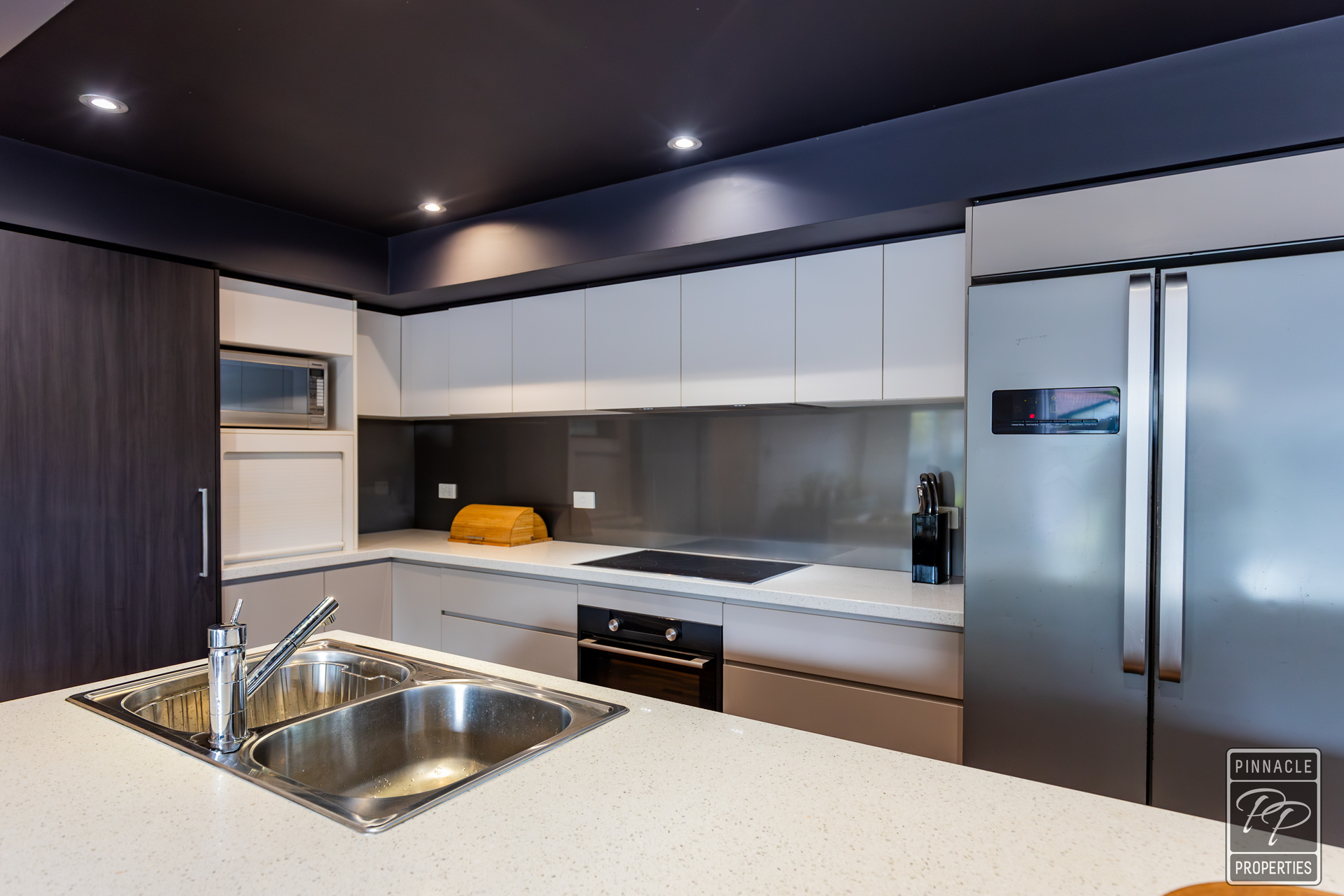 The modern kitchen, with island bench has a gorgeous stone waterfall bench top and stainless-steel appliances. The perfect place for the family or friends to gather to keep the chef company.