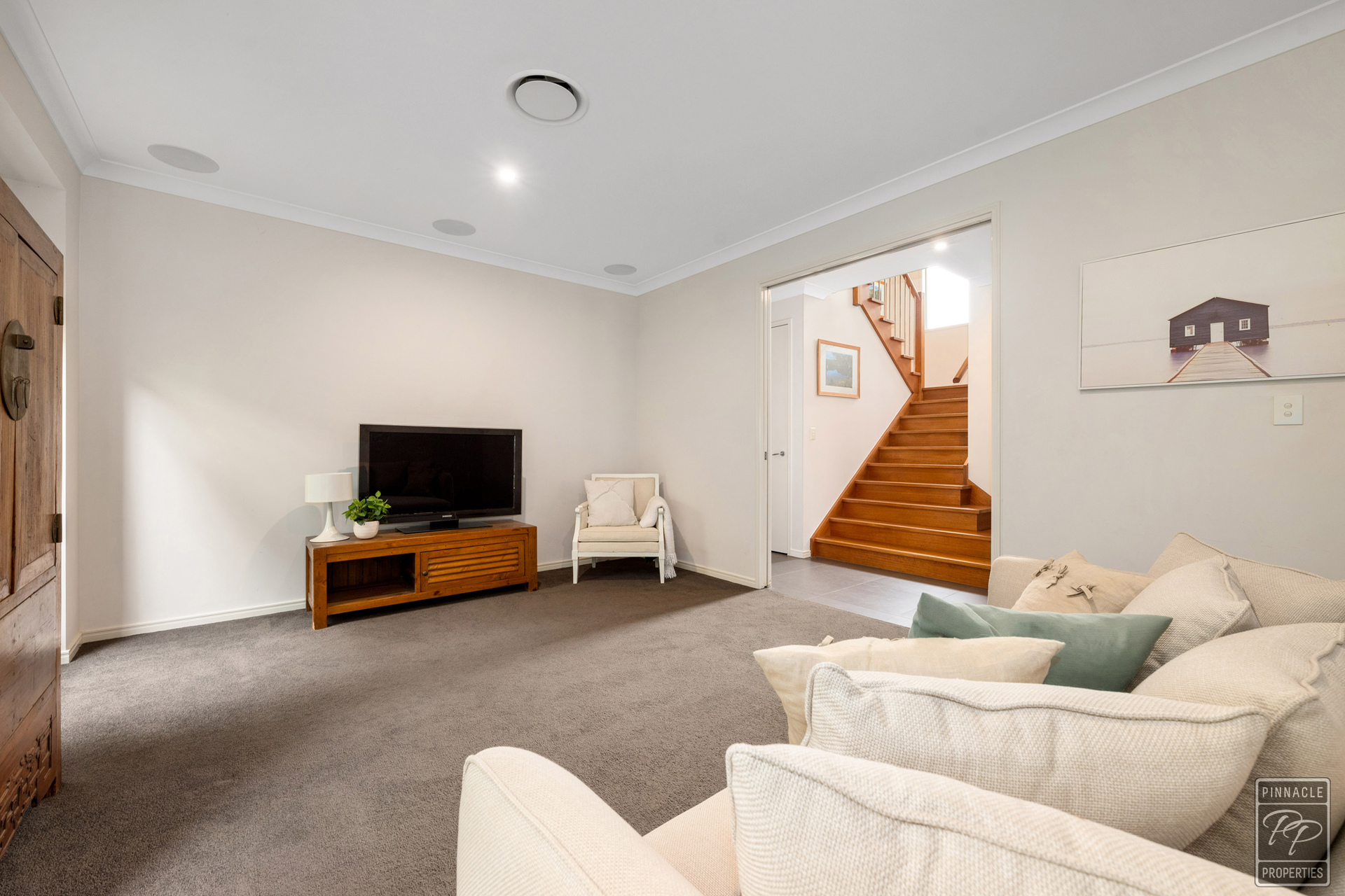 As you walk up the timber staircase you are greeted by the comfortable family room, perfect for separation.