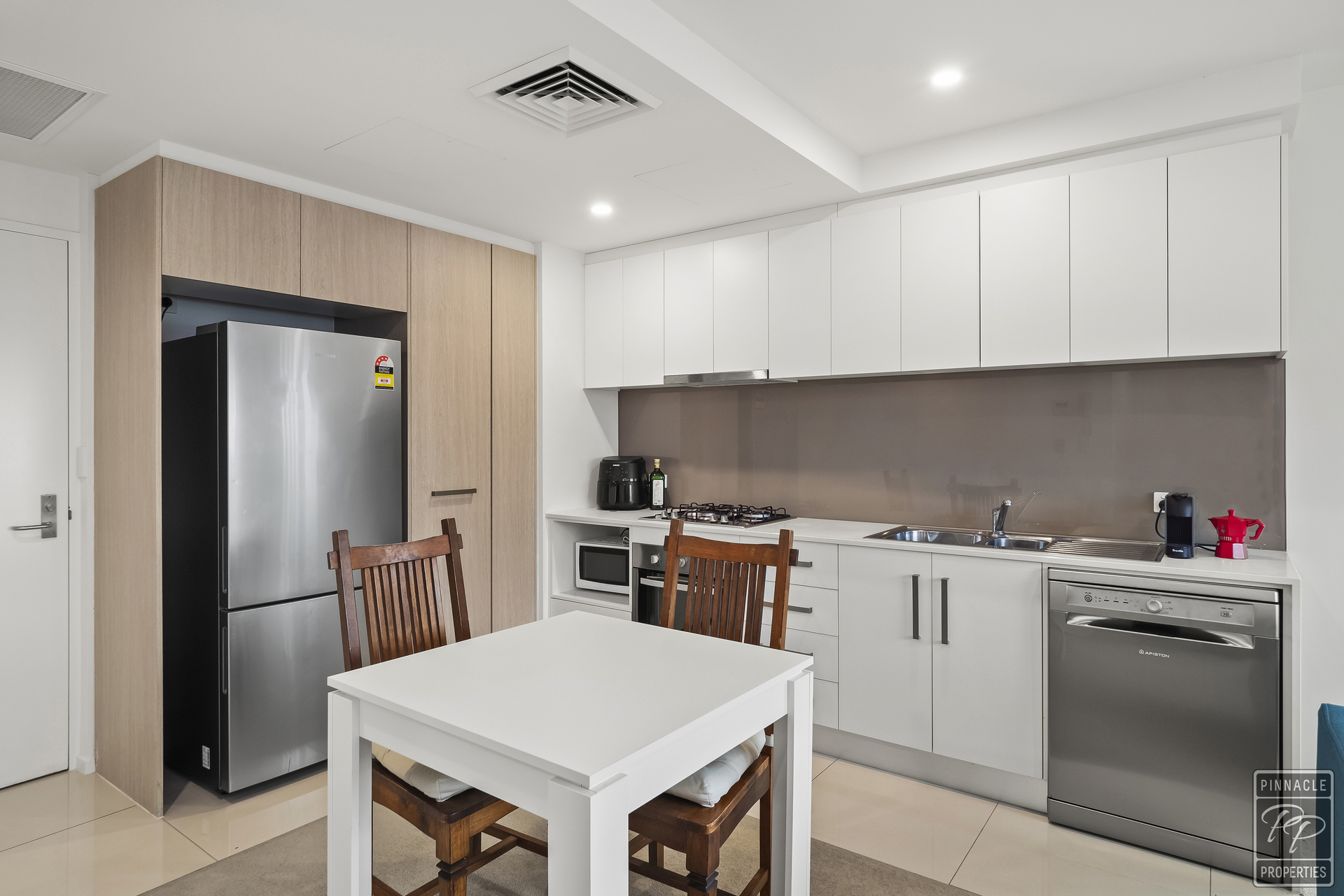 The modern, well-appointed kitchen has outstanding storage options including a pull-out pantry and quality appliances, including a gas hob, electric oven, and dishwasher.