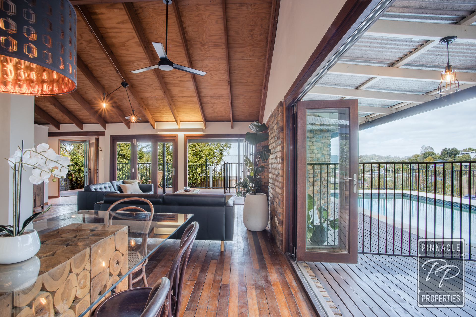 Outdoor entertaining is a dream. The beautifully positioned pool is accompanied by a large Bali Hut with a newly thatched roof - ideal for lounging or supervising the kids. Multiple covered decks offer versatile spaces for hosting everything from intimate dinners to large celebrations, all set against a backdrop of lush greenery and breathtaking vistas.
