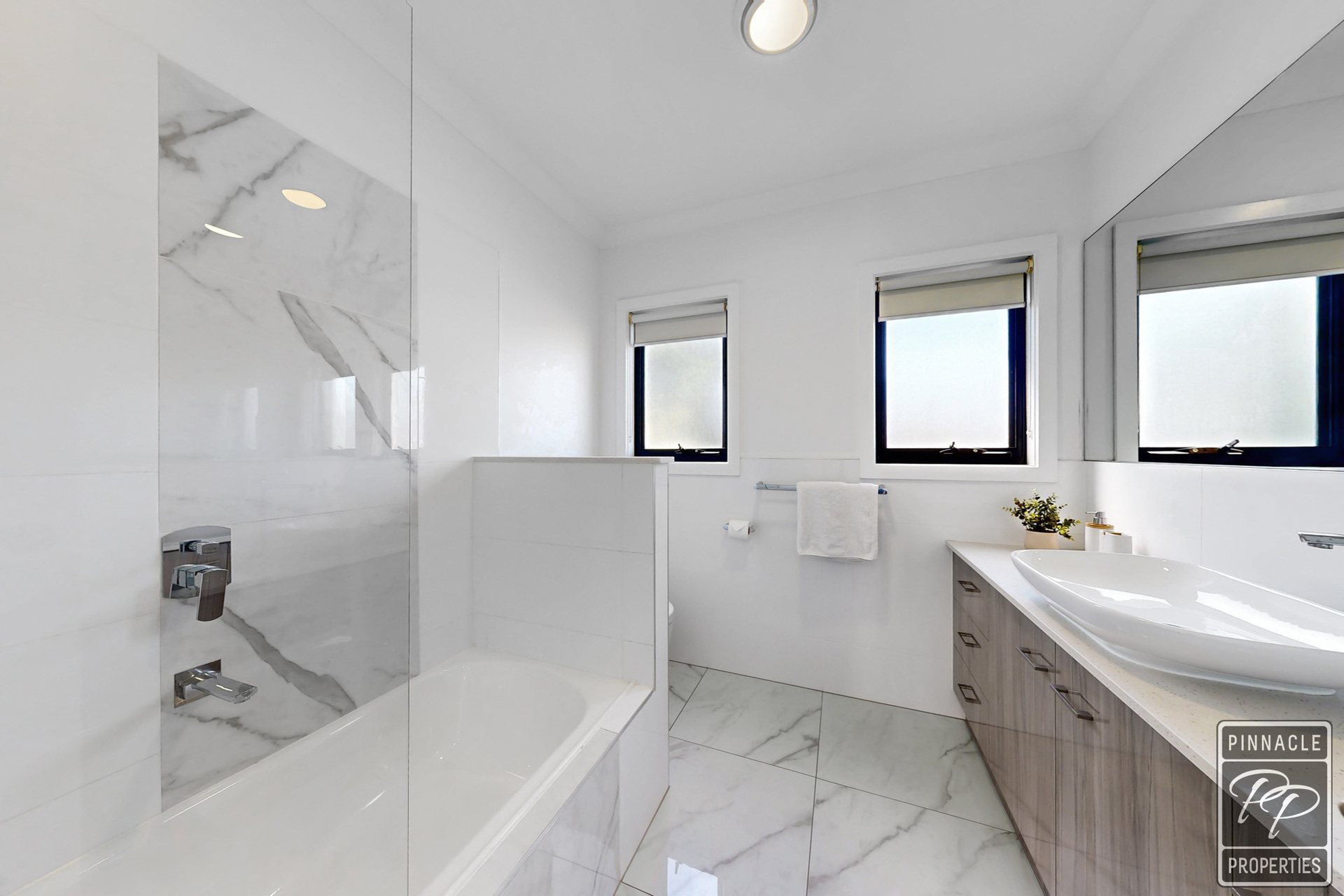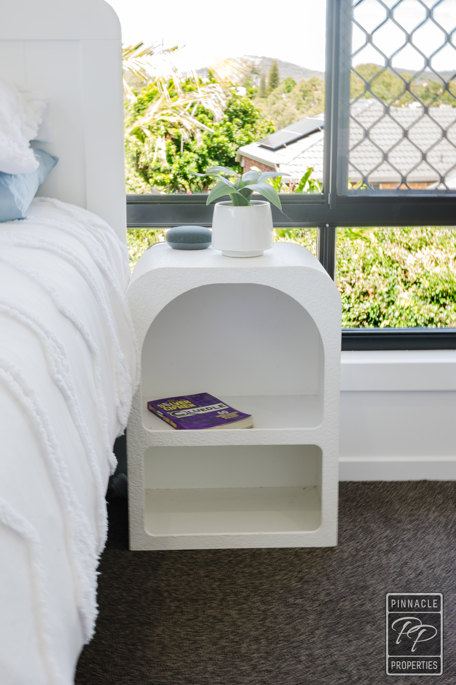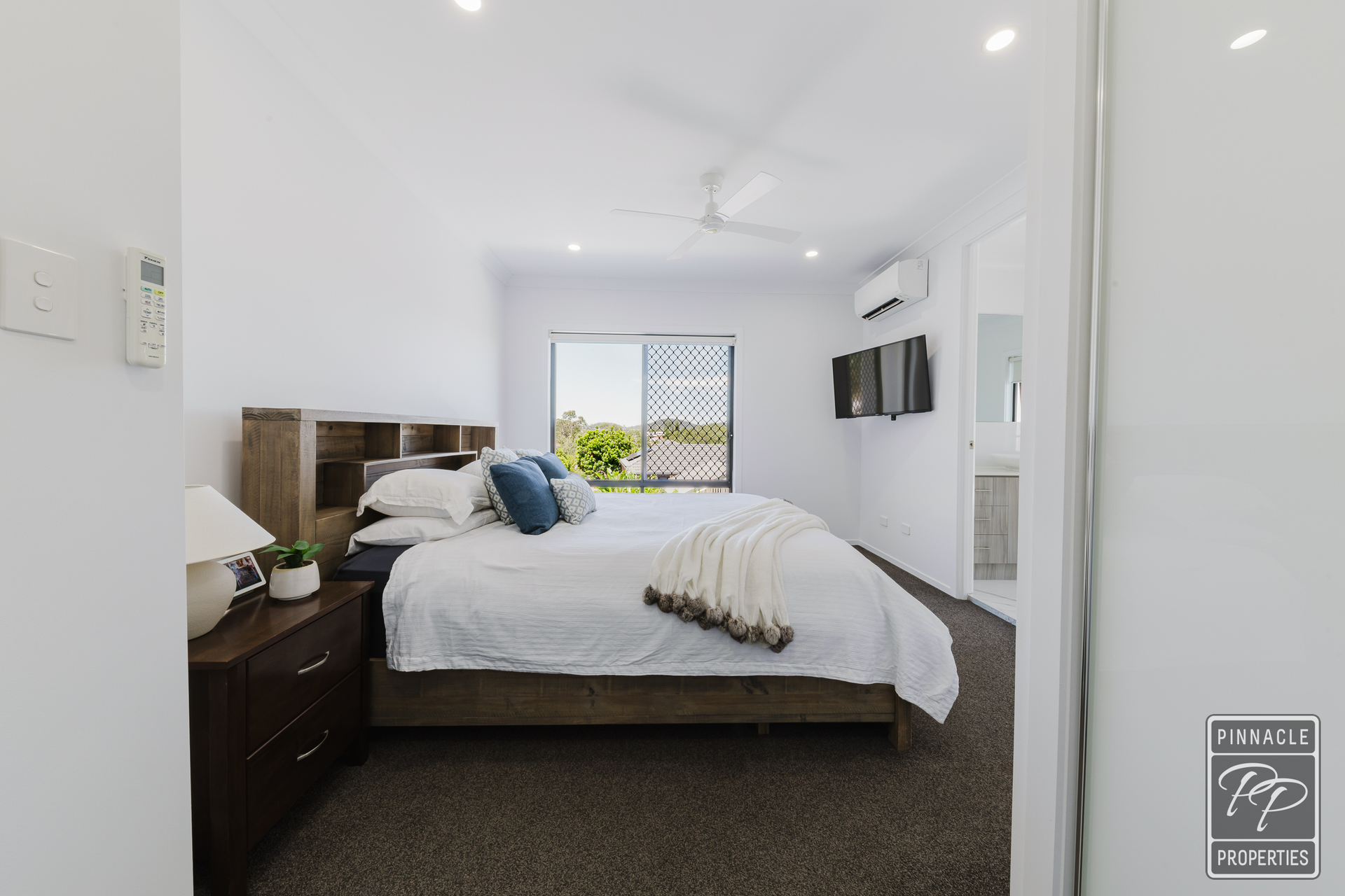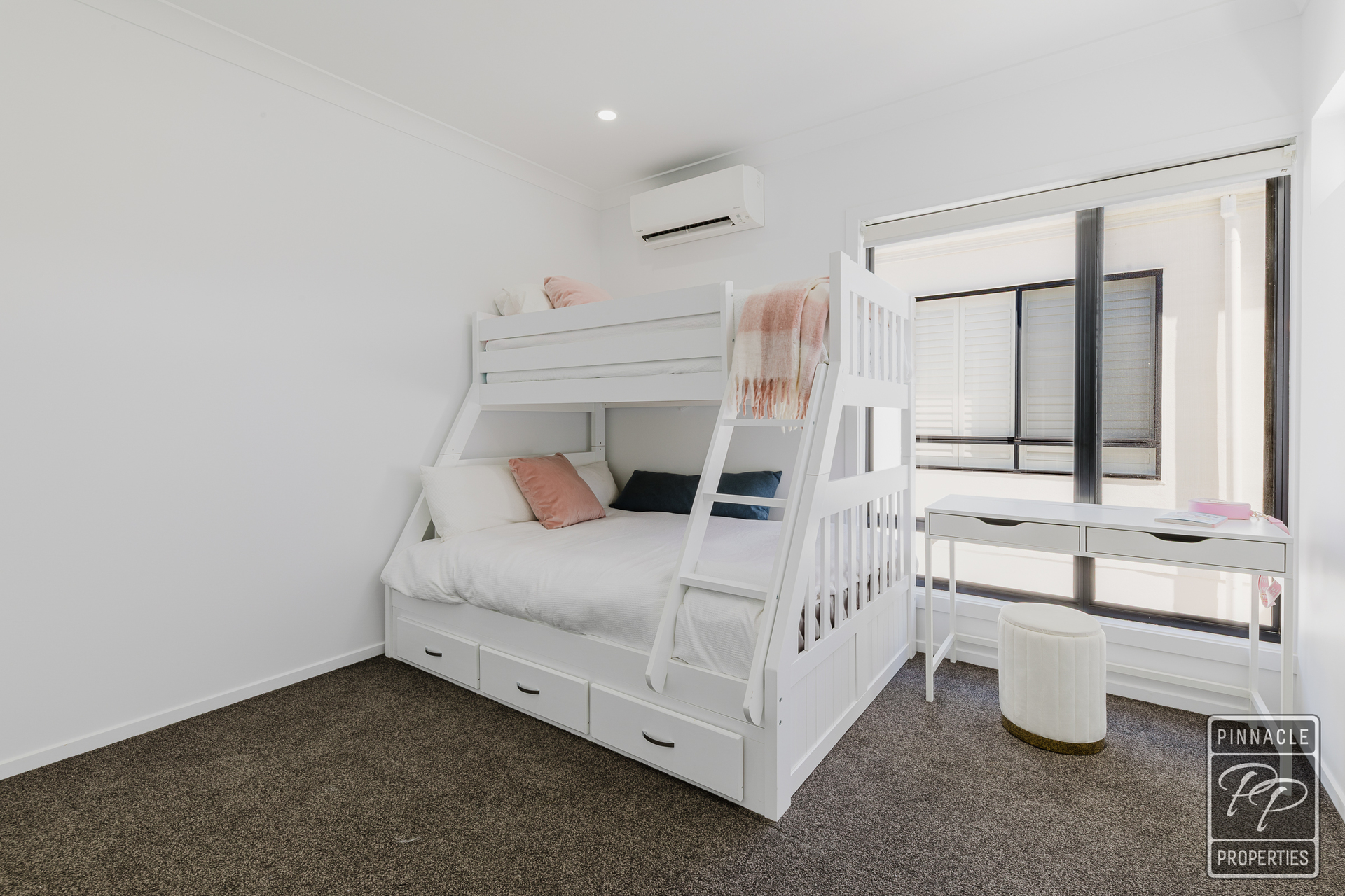 The upper level features four generously sized, fully carpeted bedrooms, all with built-in robes, ceiling fans and air conditioning. The king-sized master suite includes a spacious ensuite, while the main bathroom offers a full-sized bath and a large stone-topped vanity with excellent storage.